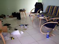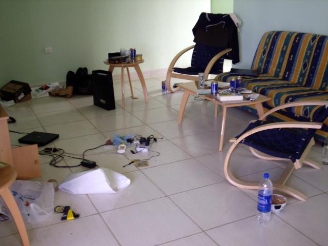 Obžérství, neskutečný obžérství s comrados. Oběd, večeře, oběd ... kotle jídel dennodenně. To je asi tak v kostce první týden. Teda, navalit si do bytu tři chlapy je docela záhul, protože za (a) chlastaj jako duha - plechovky piva úplně všude, (b) všichni IT, takže notebooky na zemi, na židli, na stole, na gauči nebo na hajzlu a k tomu 100 metrů kabelů od všeho možnýho a za (c) hadry. Propocený, zmuchlaný, zahozený ... na lustru, pod stolem, na telce ... takže taky úplne všude.